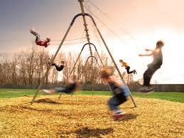 What i see in this image is a couple of kids swinging on the swings having fun, this image was taken while the kids where singing eachirther in the swings